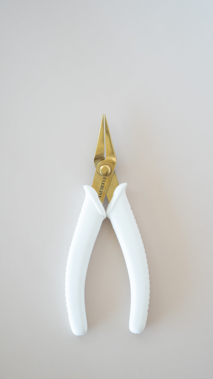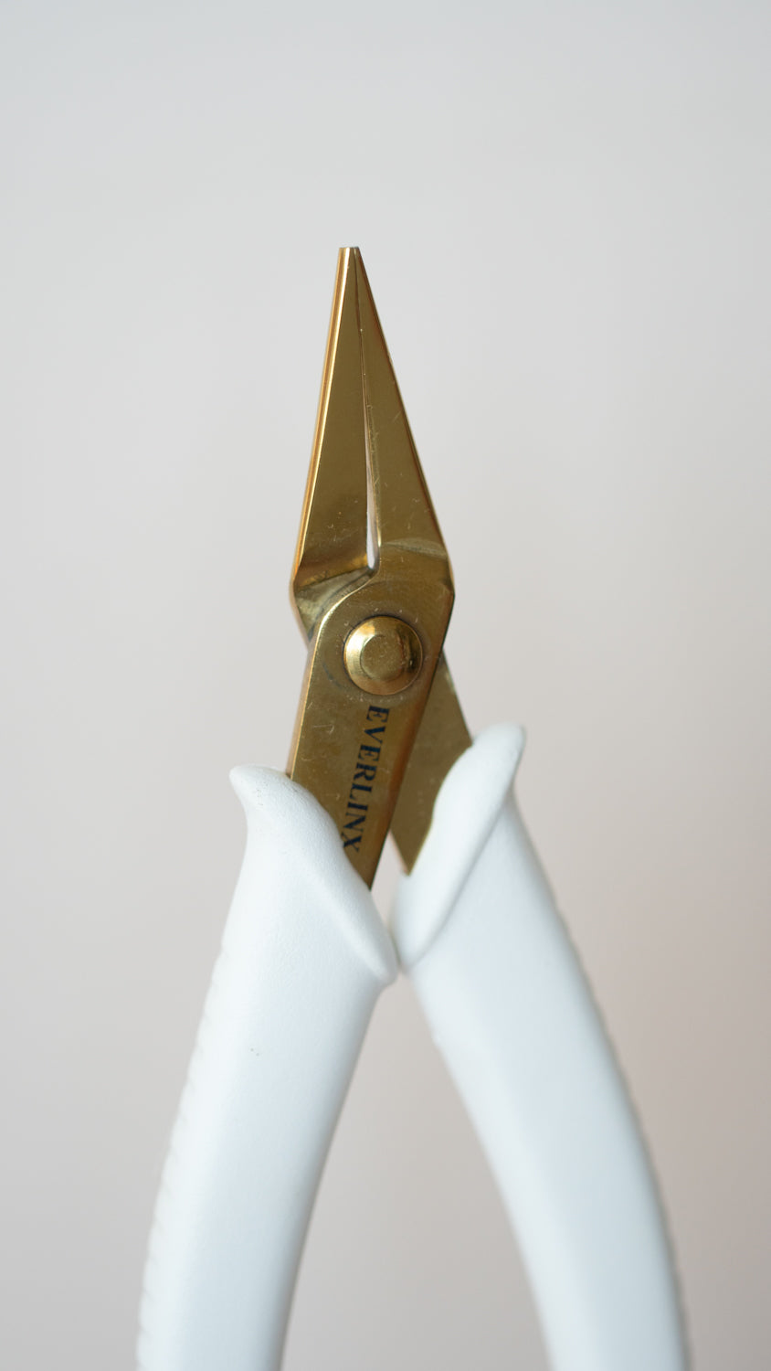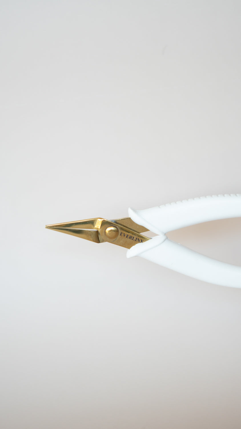 These precision needle nose pliers in white and gold are expertly designed for handling the smallest jump rings with accuracy and control. Their fine flat tips allow for delicate manipulation, making them an essential tool for detailed jewelry work and intricate permanent jewelry tasks. Durable and comfortable, they provide the precision needed for professional results.
