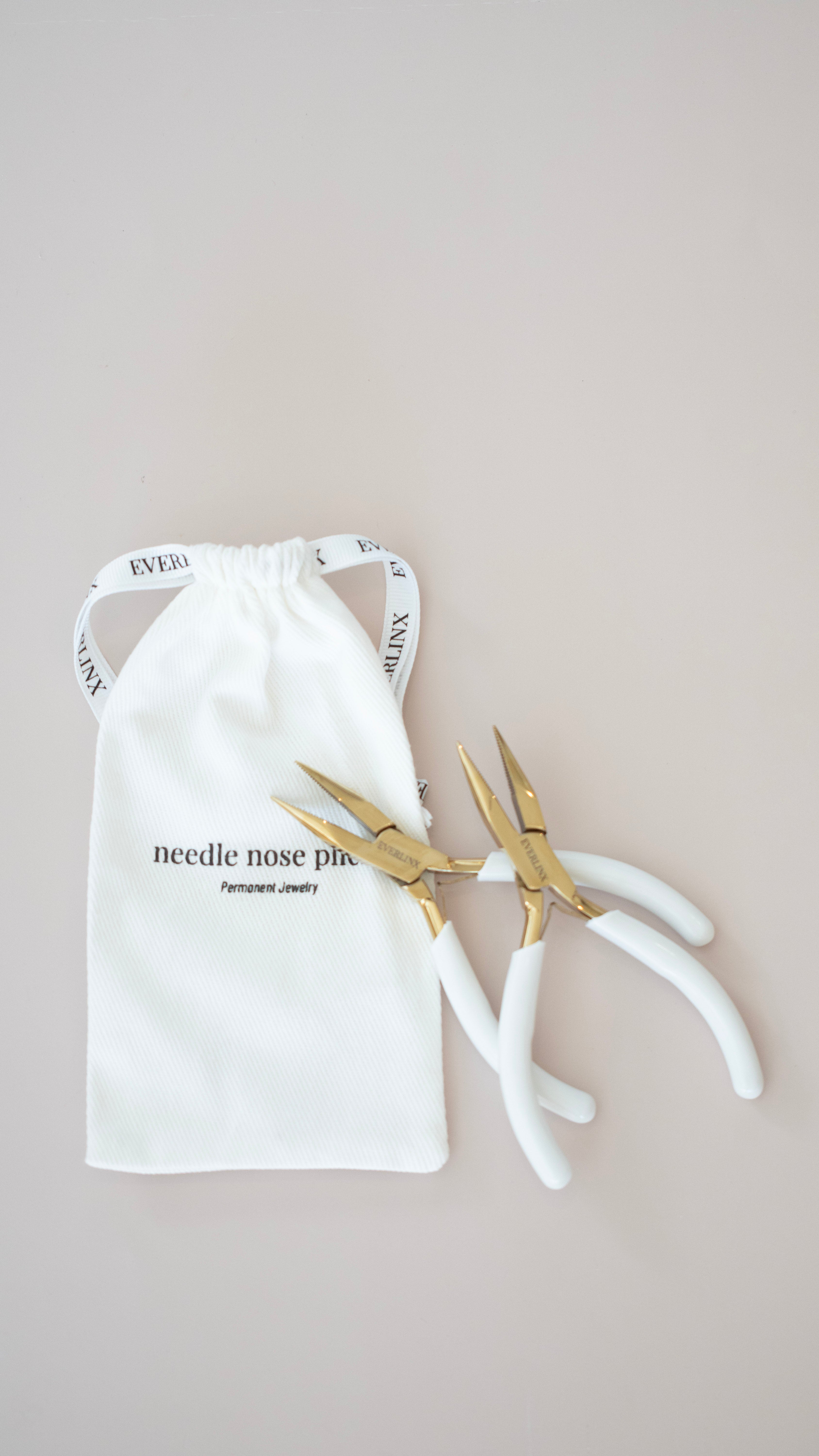 These precision needle nose pliers in white and gold are expertly designed for handling the smallest jump rings with accuracy and control. Their fine alligator teeth tips allow for delicate manipulation, making them an essential tool for detailed jewelry work and intricate permanent jewelry tasks. Durable and comfortable, they provide the precision needed for professional results.